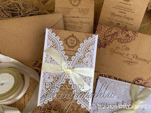 Mẫu thiệp cưới laser với giấy Kraft ưa chuộng. Thiệp cưới cắt laser bìa trắng. Giá dành cho số lượng từ 300 thiệp trở lên . Giá tiền chưa tính tiền ép kim tên. Có in sơ đồ.