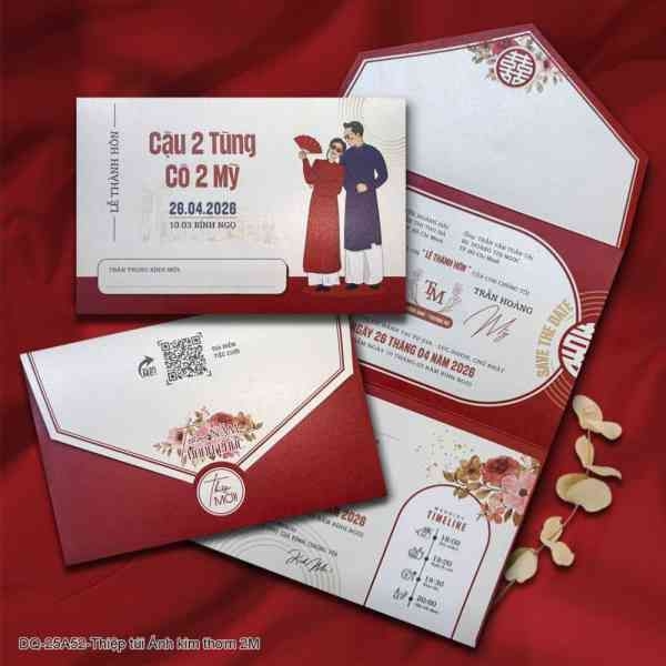 Mẫu thiệp cưới gấp 4 với thiết kế tiện lợi gồm thiệp báo tin, thiệp mời ăn và phong thư gói gọn duy nhất