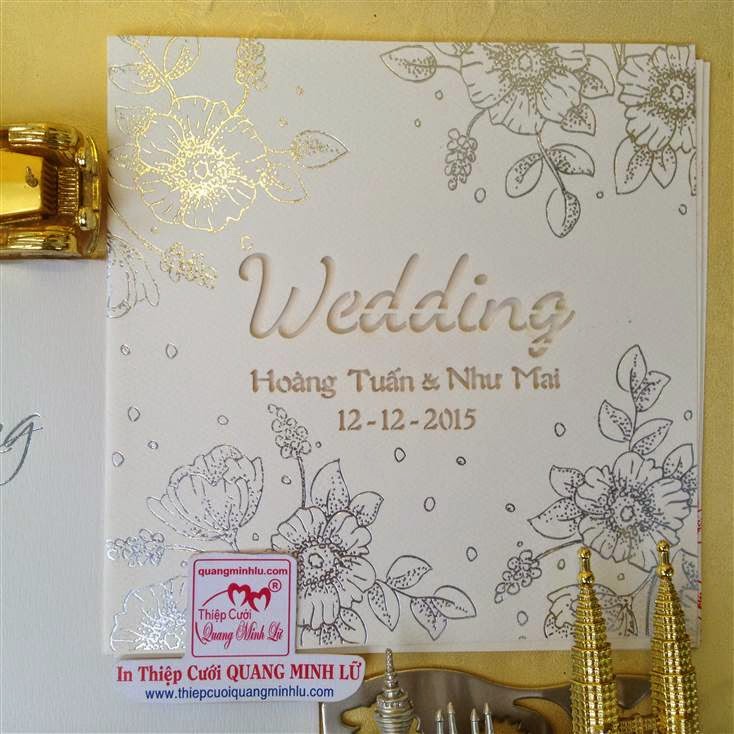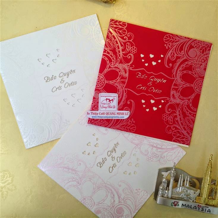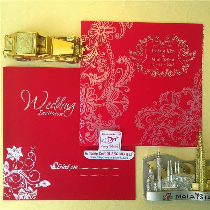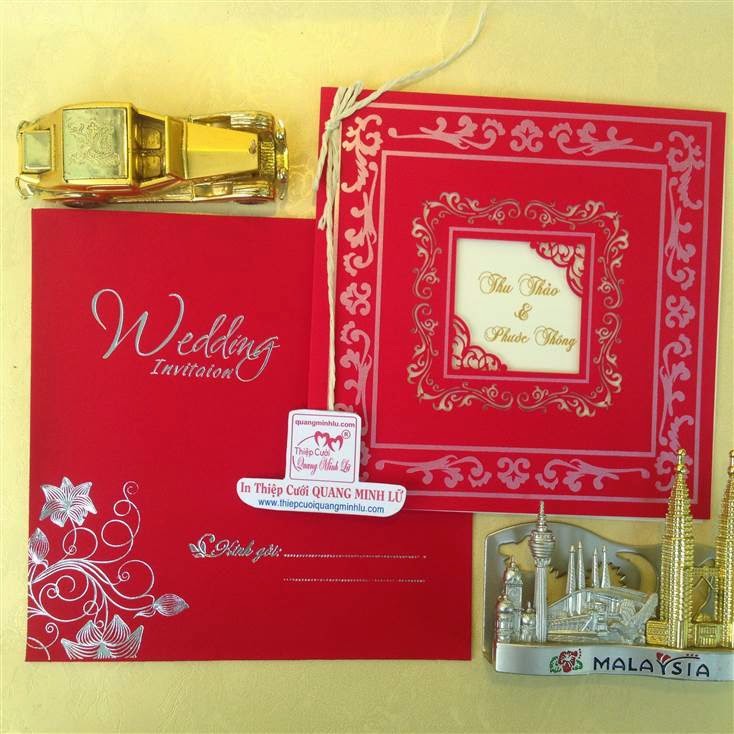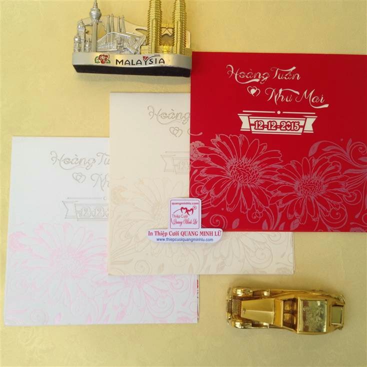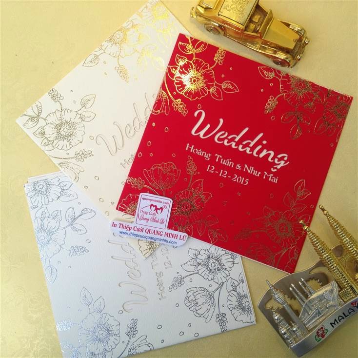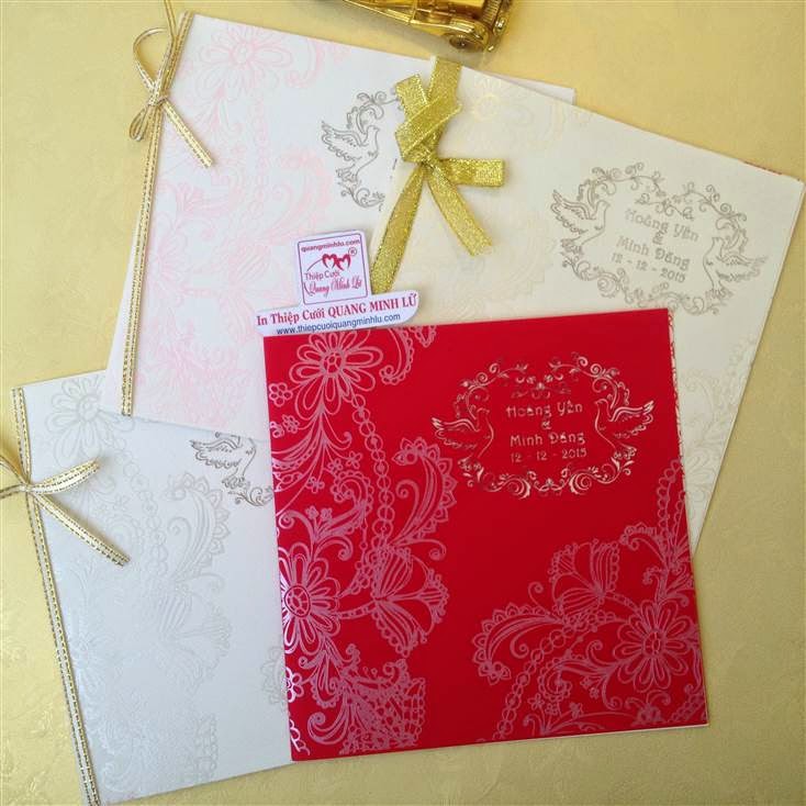 Thiệp cưới hình vuông có 2 dạng là thiệp cưới vuông mở dọc lên và thiệp cưới vuông mở sang trái . Lưu ý mẫu thiệp cưới vuông cổ điển sẽ gồm : 1 bao thơ vuông + 1 thiệp báo tin + thiệp mời ăn. Tùy mẫu thiệp sẽ có thêm bộ lót mõng bên trong nữa. Xu hướng thiệp cưới đẹp 2015 , một bộ thiệp cưới vuông được tiết giản hơn, chỉ còn 1 bao thơ vuông + 1 thiệp lớn bao gồm nội dung thiệp báo tin và thiệp mời tiệc. Dưới đây là các mẫu thiệp cưới hình vuông mở sang trái Giá tiền dành cho số lượng từ 300 thiệp trở lên.