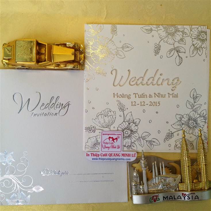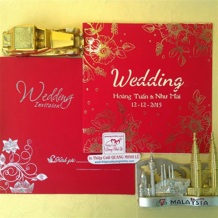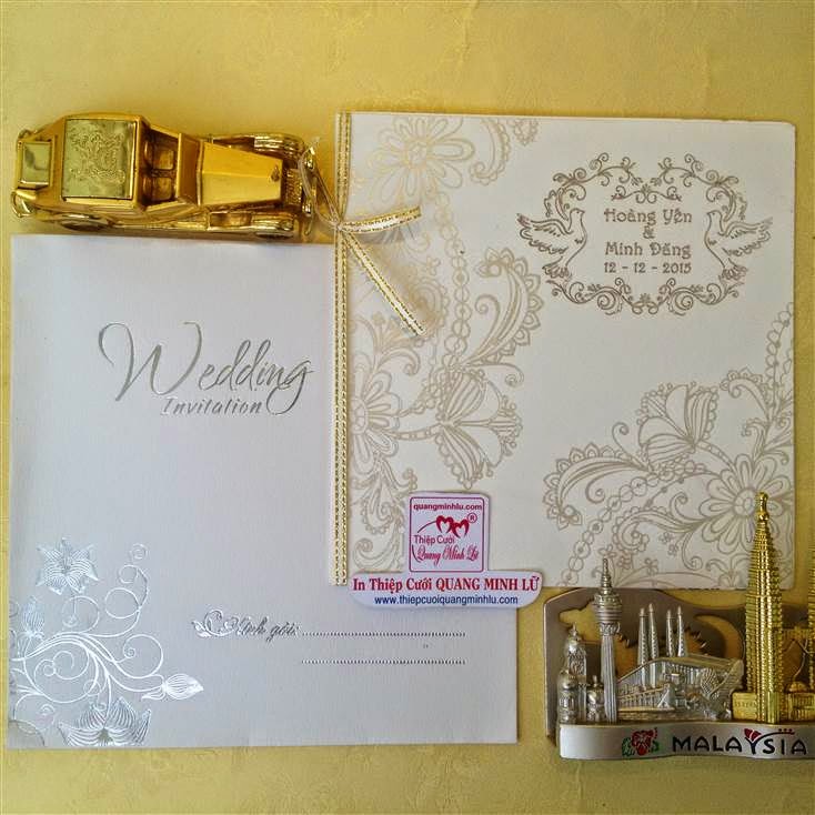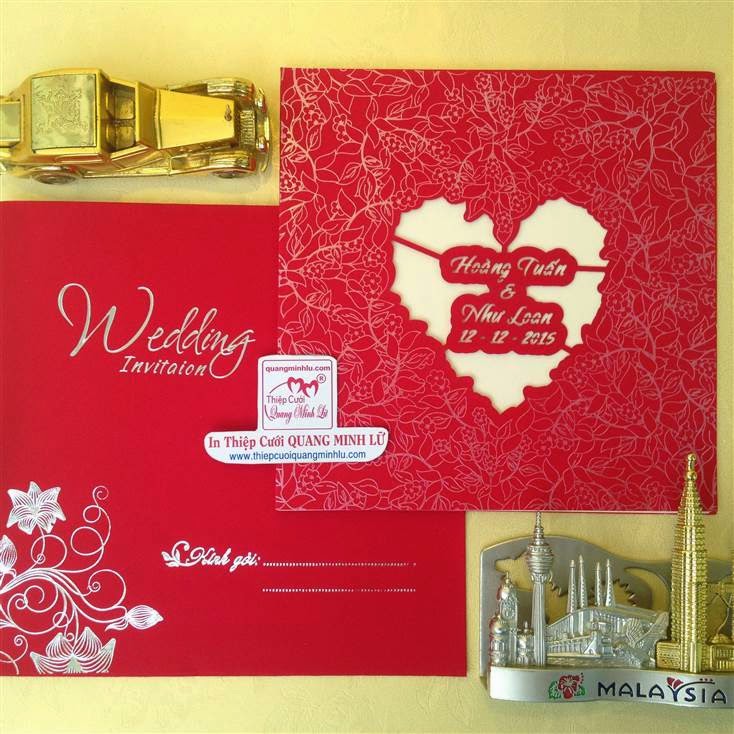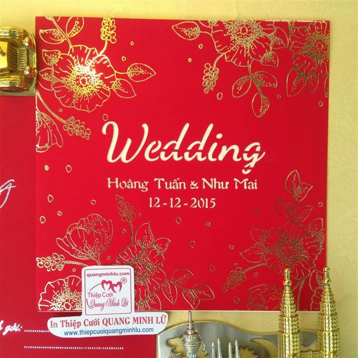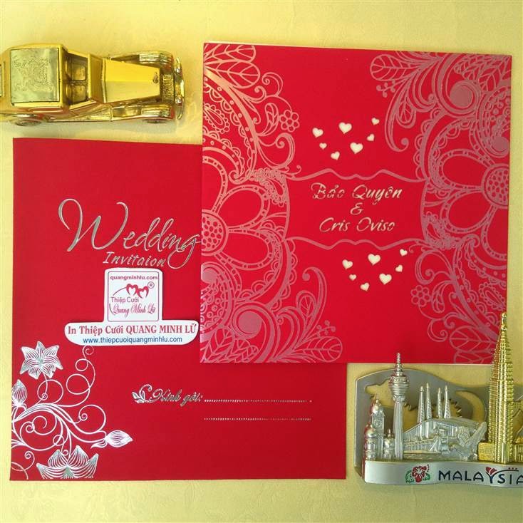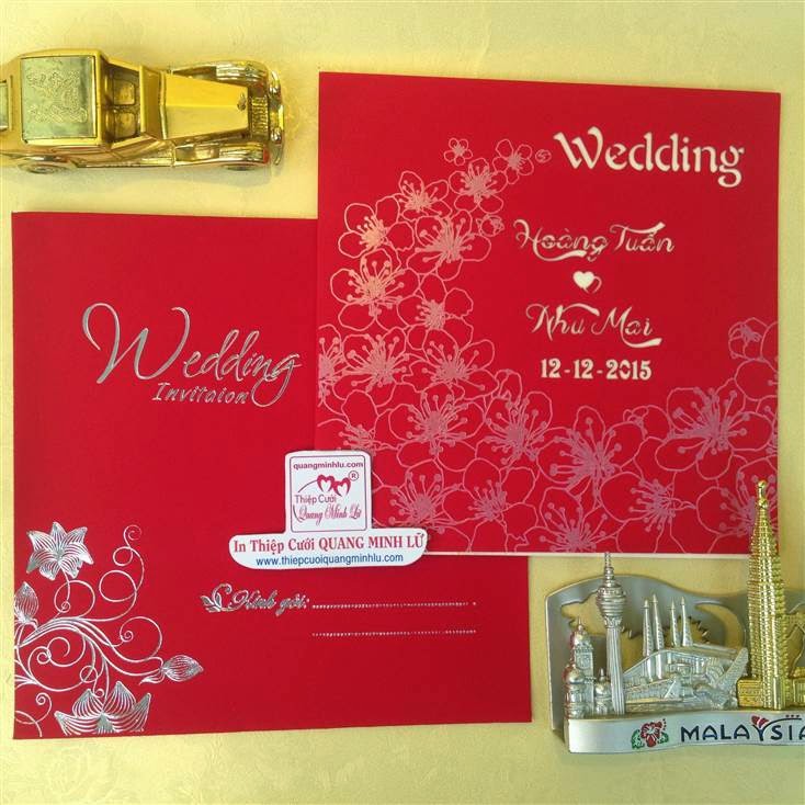 Thiệp cưới hình vuông có 2 dạng là thiệp cưới vuông mở dọc lên và thiệp cưới vuông mở sang trái . Lưu ý mẫu thiệp cưới vuông cổ điển sẽ gồm : 1 bao thơ vuông + 1 thiệp báo tin + thiệp mời ăn. Tùy mẫu thiệp sẽ có thêm bộ lót mõng bên trong nữa. Xu hướng thiệp cưới đẹp 2015 , một bộ thiệp cưới vuông được tiết giản hơn, chỉ còn 1 bao thơ vuông + 1 thiệp lớn bao gồm nội dung thiệp báo tin và thiệp mời tiệc. Dưới đây là các mẫu thiệp cưới hình vuông mở sang trái Giá tiền dành cho số lượng từ 300 thiệp trở lên.