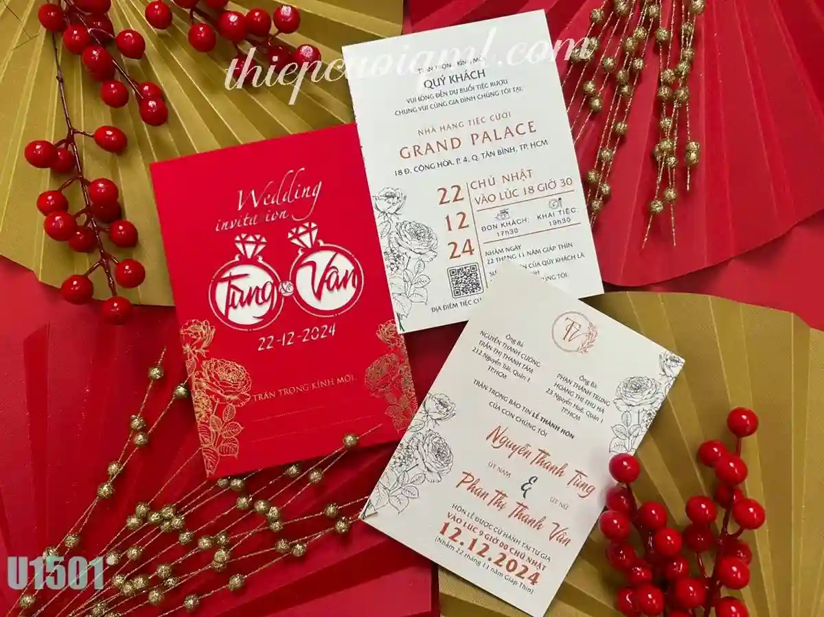 GIÁ TIỀN THIỆP DÀNH CHO SỐ LƯỢNG TỪ 250 THIỆP TRỞ LÊN Thiệp cưới laser U1501 Đỏ nhung giá 4.900đ/thiệp