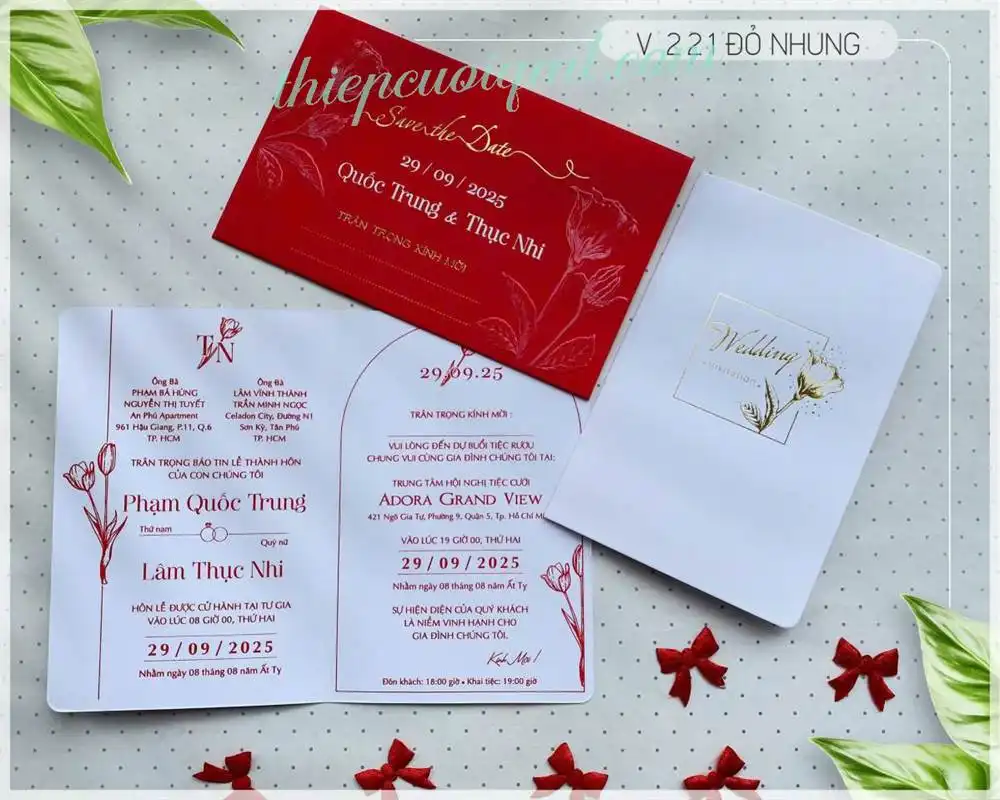 Mẫu thiệp cưới giá rẻ QV221 màu đỏ nhung in chữ thường giá 3500đ