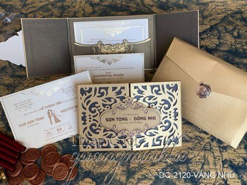 Mẫu thiệp cưới lý thái tổ A1. Thiệp cưới đẹp màu vàng đồng kết hợp màu kem trắng
